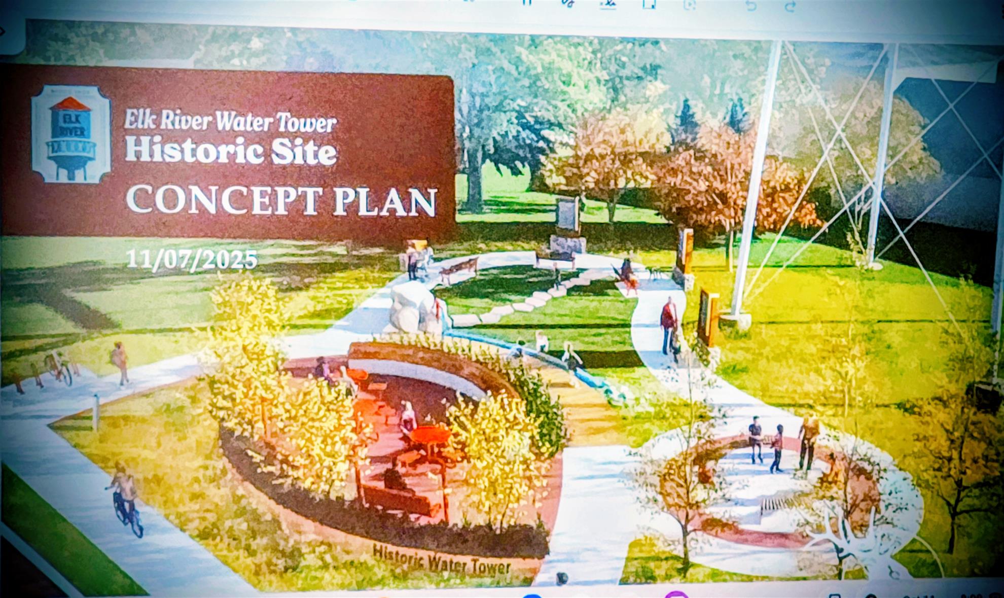 engaging space for our community. They spoke about how it was painted to its original colors 5 years ago and is now on the Historic Registry. Sandy spoke about the goals for the water tower, making it a welcoming community space, designing it for all ages and abilities to interact with the space. It will include walking paths, with story-telling markers talking about the history of Elk River the pathways, flowers, a water feature, swinging benches, café tables for people to sit at, benches and artwork. They are pursuing grants and hoping businesses or community members will adopt a tree or bench to also help fund this project.